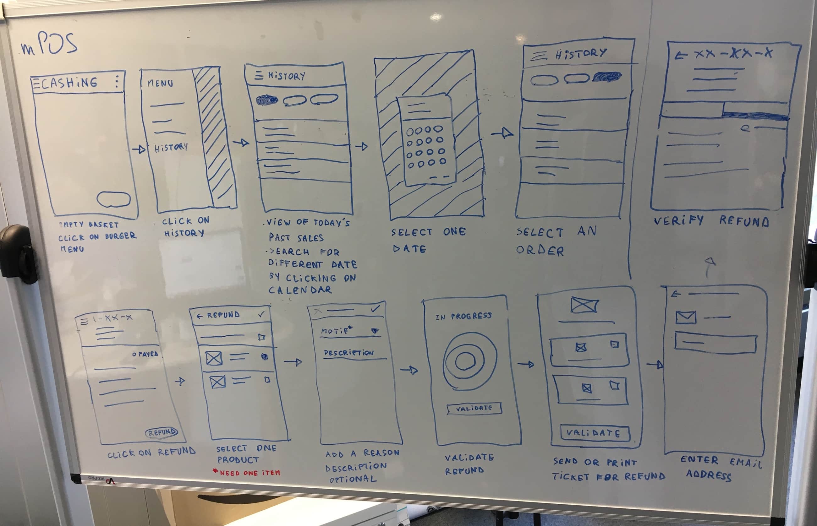 We identify the need for a clear refunding process as most customers directly ask to a shelf manager for a refund. I start mapping out on a whiteboard the different steps of a refund process from the history of recent orders. Then, I iterate my sketches by representing other ways to refund one or multiple items by scanning their bar code. These two user flows are designed in order to be tested with cashiers of Decathlon, and see which one is the most promising. Here is an overview of the refund journey of an item: