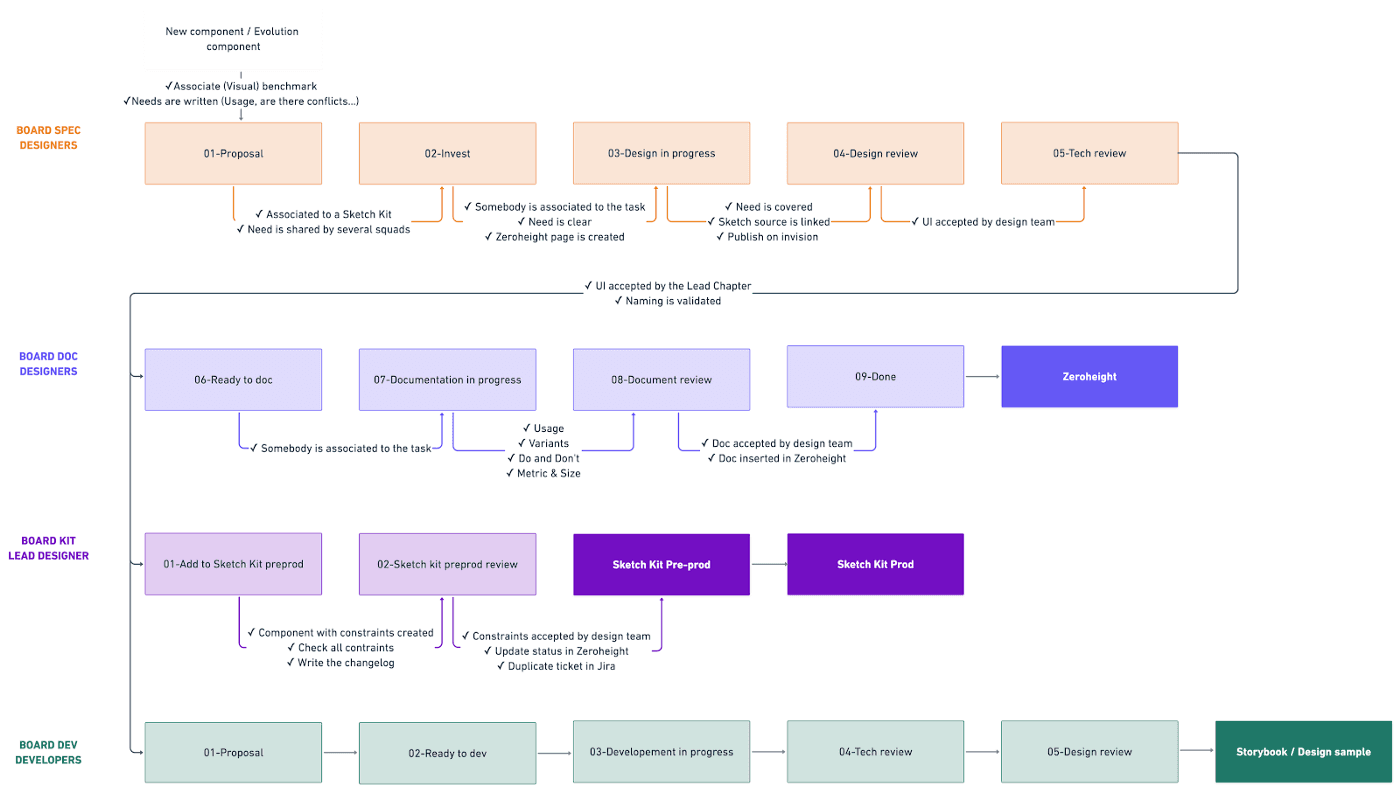 I share, exchange and review components for mobile device with all designers and lead developers during weekly round table meetings. The creation journey of a component begins with its proposal until its integration in the dev library in Storybook, through the documentation in Zeroheight. Here is the workflow we run during our round table discussions: