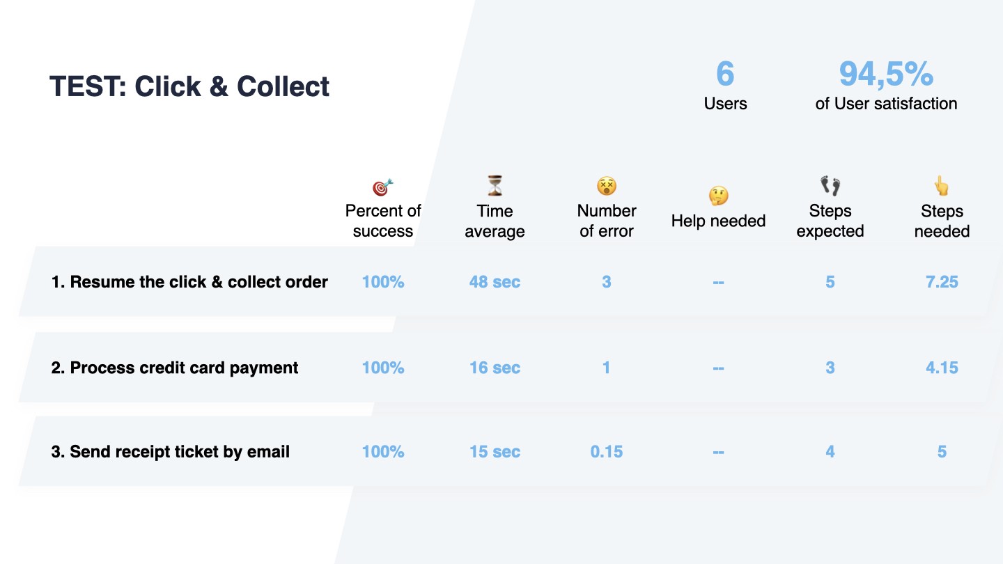 I prepare usability tests by working on user scenarios, and listing design hypothesis to validate. I succinctly write the tasks the cashiers have to accomplish. Here is a shared template that gives guidelines on how to approach a user test in addition to the one I did to test the click and collect experience.